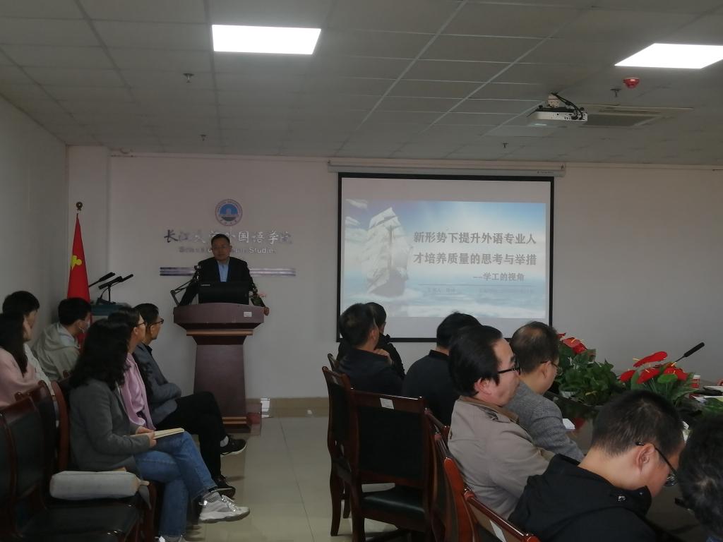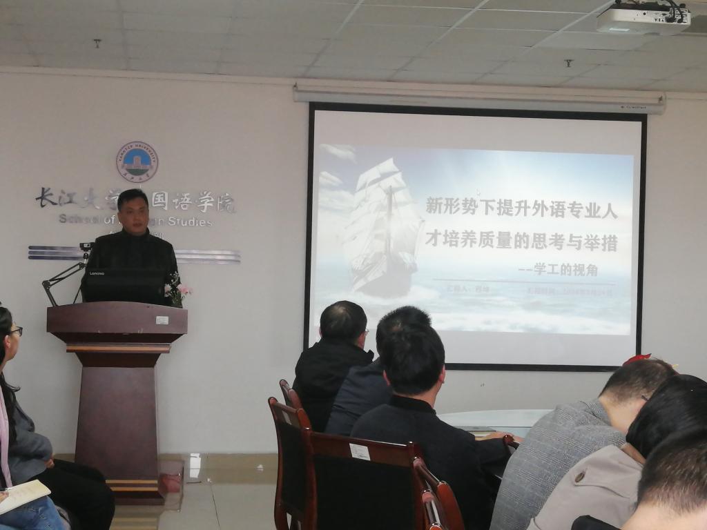 接下来,党委副书记程坤从学工视角做题为《新形势下提升外语专业人才培养质量的思考与举措》的汇报,他首先介绍学院人才培养质量现状,提出学生工作如何顺应外语教育政策的价值取向和回应国家发展战略的关切需求的思考。他提出兼容并蓄,为所当为,以教育转型、学风建设和专业提质三个方面促进学生与老师相互成就。