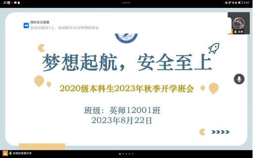 (通讯员 许泽琼)2023年8月20日-24日,澳门网投官网通过线上会议的方式全面开展了“梦想起航,安全至上”为主题的2023年秋季学期开学前安全教育班会,就开学工作、安全教育、开学心理调适、学业规划等方面进行讲解说明及要求部署。此次主题教育班会由年级辅导员、各班班主任主持,全体本科生和研究生参会。
