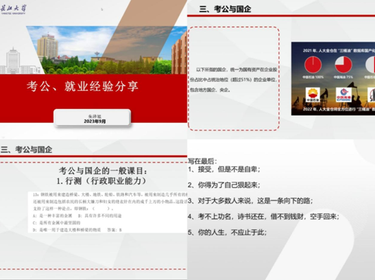 会议伊始,朱哲旭作了简单的自我介绍,并向同学们介绍了他的求职经历。他就考公务员和进入国有企业应注意的事项向同学们进行了详细指导,并为同学们提供了国有企业的判断条件和笔试的一般科目。此外,他还说明了进普通公司的简历中要必须包含的重要内容和一些有助于面试成功的条件。最后,朱哲旭鼓励同学们要发愤图强,走出舒适区,创造属于自己的美好明天。