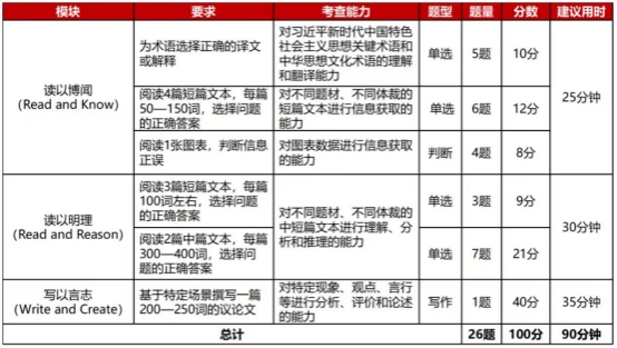 综合能力赛项笔试赛题由大赛组委会提供,包括客观题若干道、汉译英1 篇、议论文写作 1 篇。