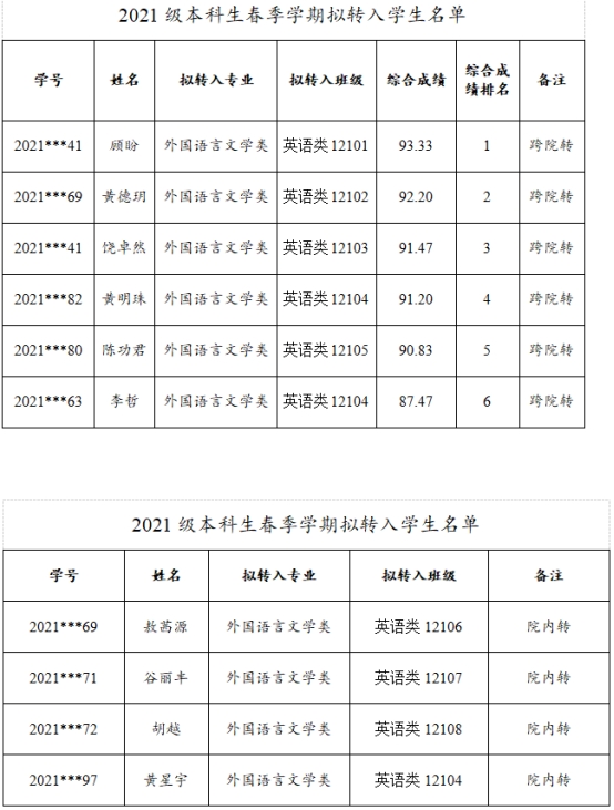 澳门网投唯一官网2021级本科生春季学期转专业拟接收名单公示