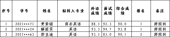 根据《澳门网投唯一官网普通本科生专业分流与转专业管理办法(试行)》(长大校发〔2019260号)文件以及教务处《关于2021级普通本科生秋季转专业工作的通知》要求,结合澳门网投唯一官网2021级本科生转专业工作方案的具体安排,澳门网投官网于97日下午组织了对拟转入学生的面试。综合英语成绩和面试成绩,经澳门网投官网党政联席会讨论通过,现将拟接收名单公示如下: