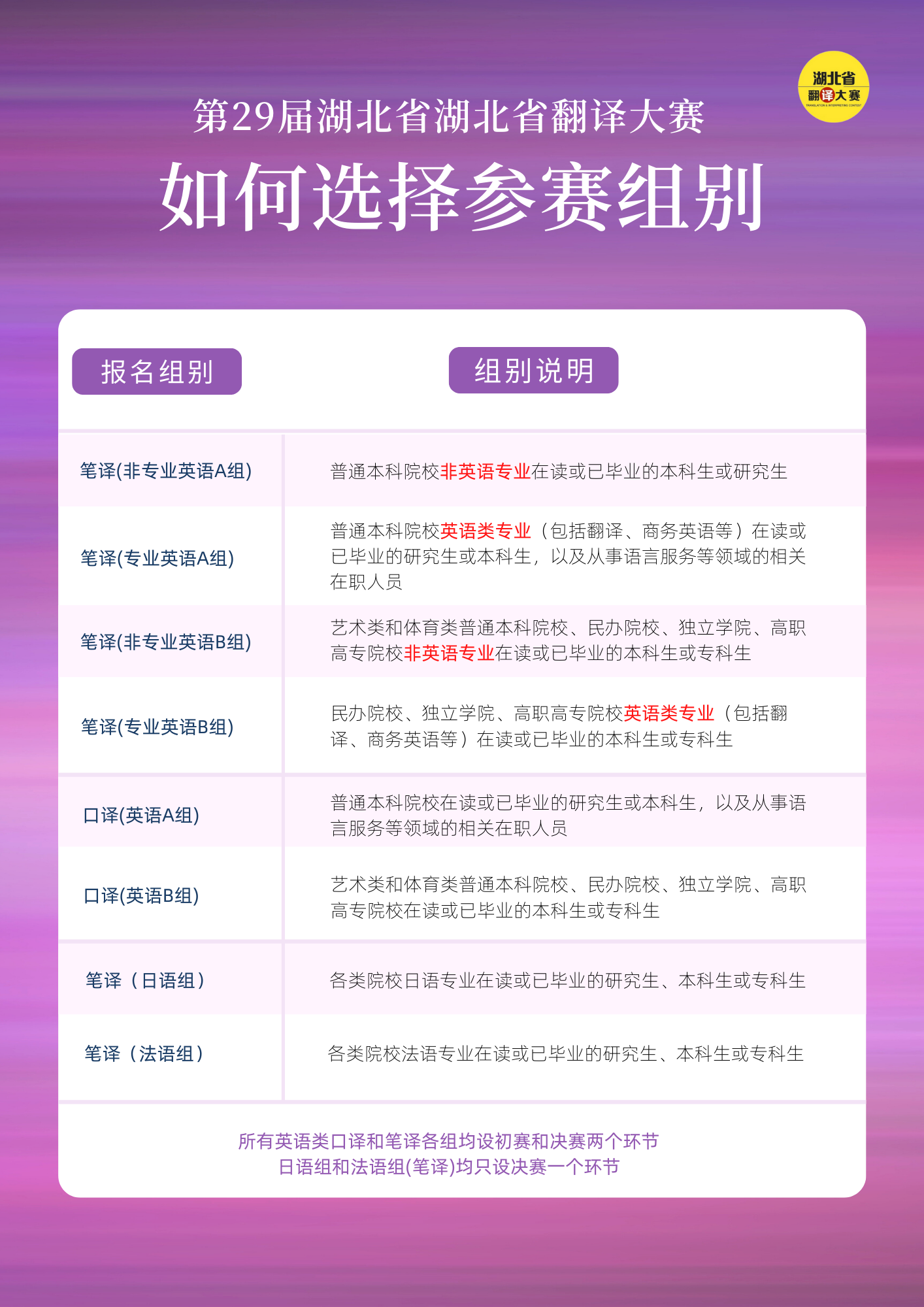 (3)线下报名:部分赛点支持线下报名,将在大赛官方微信公众号“第29届湖北省翻译大赛”公示线下报名单位和学校;
