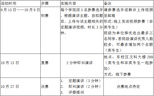 3)报名方式:以学院为单位集中报名。各分团委学生会请于10月8日17:00前择优推荐5名选手,并将报名汇总表以“XX学院—澳门网投唯一官网外研社·国才杯英文演讲比赛”命名后发送至邮箱3027311928@qq.com;并提醒选手上传视频到邮箱3027311928@qq.com并通知选手加入2022澳门网投唯一官网英语演讲比赛群,获取更多信息和比赛指导。