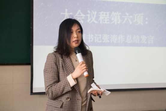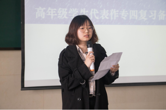 随后,高年级学生代表向同学们分享了关于专四复习备考经验。他们主要从个人的备考经验和班级备考经验两个方面进行了讲述。日语语言11601翟倩建议同学们:少想多做,调整心态,“拒绝“自怜和焦虑情绪,不“假努力”,不“自己感动自己”。并从单词、语法和真题学习方法这三个方面进行了分享;建议班级每天有计划性地听写单词,开展班级内部专四动员分享会,或者分组学习。周梦悦从各个题型上向同学们给出了建议。她认为:语法需注重特殊用法,错题要吃透,写作要从结构、观点和用词三个方面把握。论点简短有力、切入点独到、阐述清晰才是一篇好作文的特征。要用批判的眼光研究和学习范文,而不是整篇背诵;班级的备考则要注重跟着老师的节奏走。