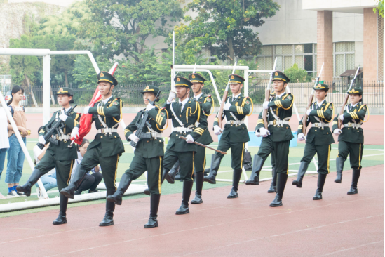 第一项进行的是迎国旗,随着一声令下,国旗护卫队踏着整齐划一的步伐,正步走到国旗杆前,护旗手郑重的将国旗放在旗杆上,准备升旗。接下来是升国旗,奏唱国歌,全体师生都对国旗行注目礼,在国歌声中,国旗冉冉升起。升旗完毕,升旗手有序退场。