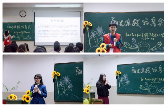 首先是“阳光荆博”实践活动的心得分享,志愿者李小雪向大家讲述了活动有关内容。该活动由荆州博物馆、阳光荆博行与熊家冢三部分主体构成,旨在弘扬荆楚文化,传播五四精神,激发当代大学生的历史荣誉感。其次是关于暑期支教活动,商务英语11702班吴杰、商务英语11703班李丹分别分享各自经历,他们的诙谐话语透露出支教生活的忙碌充实,李丹的酸甜苦辣小集合更是志愿者们生活的缩影。