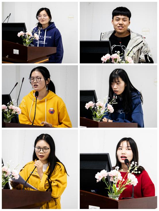 主持人童超介绍了大会的四个流程:教学院长彭泝宣读表彰名单、英语系主任王娟和带队老师蒋娟颁发荣誉证书、学生代表发言、带队老师殷华做实习情况总结。