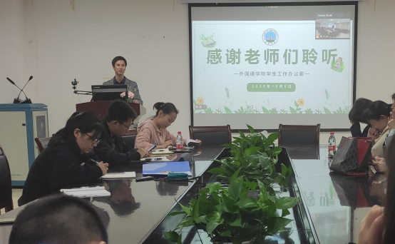 (通讯员:刘庸)为确保疫情防控常态化管理的有效进行,提高疫情后和进入秋冬季高关怀学生的识别能力,澳门网投官网于10月9日通过线上线下相结合的方式召开全院班主任工作会议。会议由党委副书记魏红洁主持,党委书记危煜祥、院长谈宏慧、学工办全体老师和各年级班主任老师参加了会议。