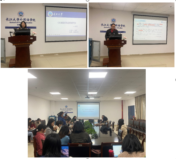 本次报告会伊始,张琴同学基于《快乐王子》等文学作品,带领大家探索了文学作品中“双重叙事进程”手法的运用。介绍完毕后,张琴同学就大家的提问进行解答,常芬老师也进行了相应的补充并建议要把研究当中的专业概念区分清楚。接着,杨帆从自己生活体验出发,通过阅读大量的文献,研究了“回归词”的归属问题。在解答完同学们的疑惑之后,常芬老师提出了两点建议:第一,在做汇报的时候要注意使用相对正式的语言,避免太多口语化的表达;第二,在文献阅读上还需要多阅读日文文献以及英文文献。