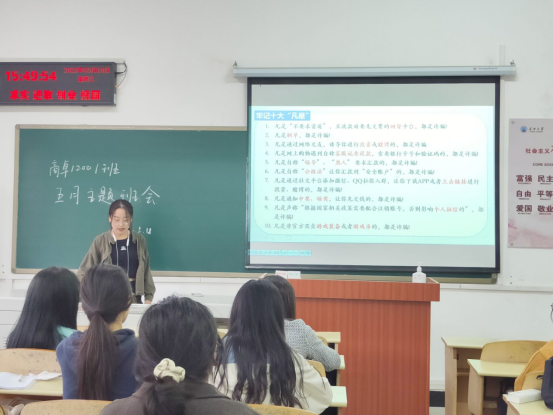 班会上,同学们在班主任老师和班长的带领下认真学习了中共中央政治局常务委员会会议精神、国务院联防联控机制召开电视电话会议精神以及全省疫情防控工作电视电话会议精神,重点学习了《高等学校新冠肺炎疫情防控技术方案(第五版)》和学校《关于强化学生个人疫情防控责任的通知》精神。班主任老师们分析当前省内和全国疫情防控的形势,解读学校当前日常管理制度背后的内涵,举例全国各高校公布的防控危机事件,提示同学们认真遵守校纪校规和相关防疫规定。同学们承诺会主动学习防控政策,关注防疫新闻,加强个人防护,全面服从学校疫情防控管理要求,积极配合学校日常管理工作,与学校一起面对这场没有硝烟的战争。