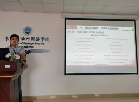 学院党委副书记、纪委委员程坤以《明纪法 知敬畏 守底线 做清廉守纪阳光外院人》为题,向大家解读了《中国共产党纪律处分条例》和《新时代高校教师职业行为十项准则》,并以近年来发生在高校的典型案例对大家开展了警示教育。