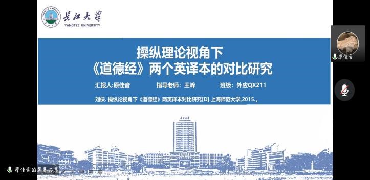 紧接着,原佳音同学向大家介绍了操纵理论视角下《道德经》两个英译本的对比研究。她首先为大家讲解了《道德经》与老子的相关知识。然后分别介绍了《道德经》英译历史及两位著名译者理雅各(James Legge)与刘殿爵,接着结合勒菲弗尔(André Lefevere)的操纵理论从两个译本的意识形态、诗学、赞助人三个维度展开详细分析。最后总结了这三个因素与文学翻译之间相互影响的关系。