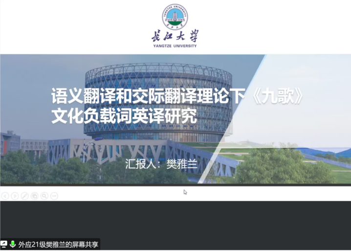 首先由樊雅兰同学为大家做了汇报,她的报告主题是:语义翻译和交际翻译理论下《九歌》文化负载词英译研究。她首先从引言入手,为大家介绍楚文化相关背景知识。然后借助简洁凝练的文献综述总结国内外学者对楚文化的研究进展,并结合具体学者如Thomas Michael对“巫”的持续研究进行详细说明。最后着重阐述了她的个案研究过程,结合生态、物质、社会、宗教以及语言五个维度的文化负载词进行了详细分析,呈现了英译本既忠实原文又传递文化信息的倾向。