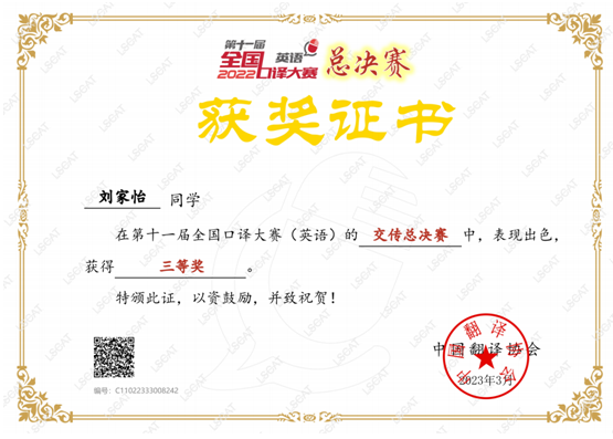 近日,第十一届全国口译大赛全国总决赛落幕,我校英语笔译专业研究生刘家怡表现出色,获全国口译大赛(英语)交传总决赛三等奖。