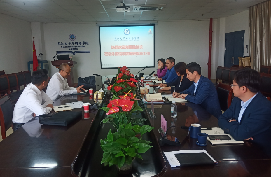 在听取学院工作汇报后,刘勇胜就学院发展提出建设性意见。他表示,在人工智能及网络信息化的挑战下,外语教育及实践教学如何发展值得深入思考;学院如何改革、专业如何调整、学科如何发展,需要充分发挥学院领导班子的集体智慧。他强调,学院发展应该紧跟国家政策、利用区域资源、结合学校优势学科,更好地发挥好语言的工具作用;要充分发挥专业教师优势,挖掘基础英语教材亮点,助力学校国际交流合作;同时围绕学校发展总体目标,结合学院实际,在保基础的前提下,凝练学院发展特色。