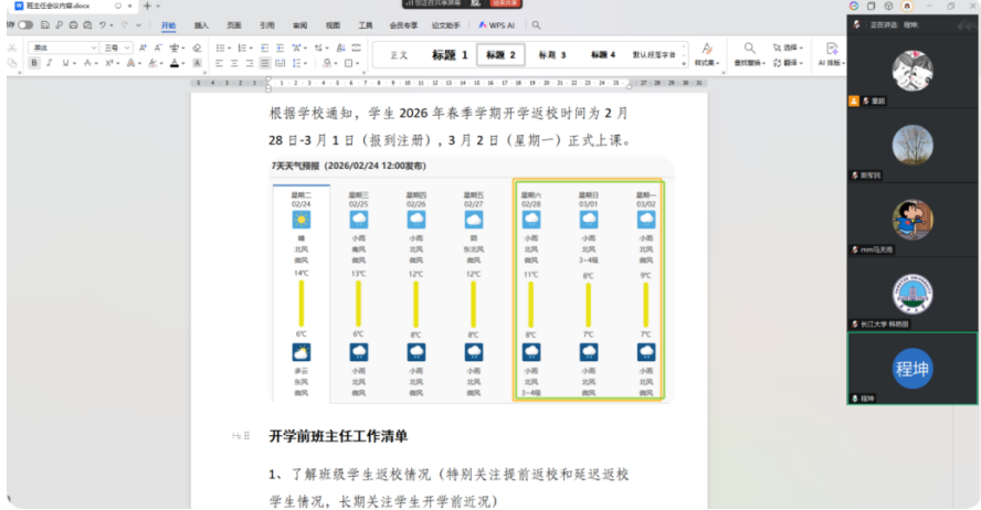 会上,学院学工办主任童超老师首先向班主任和辅导员传达学校关于开学前工作内容和要求,讲解了班主任工作清单,要求班主任精准掌握学生返校情况,重点关注提前返校、延迟返校学生动态。学院党委副书记程坤提工作要求:一是提高站位,详细掌握学生返校情况;二是加强关心,及时了解学生寒假在家生活学习状况;三是精准指导,尽早帮助学生做好新学期规划,尽快进入学习状态。