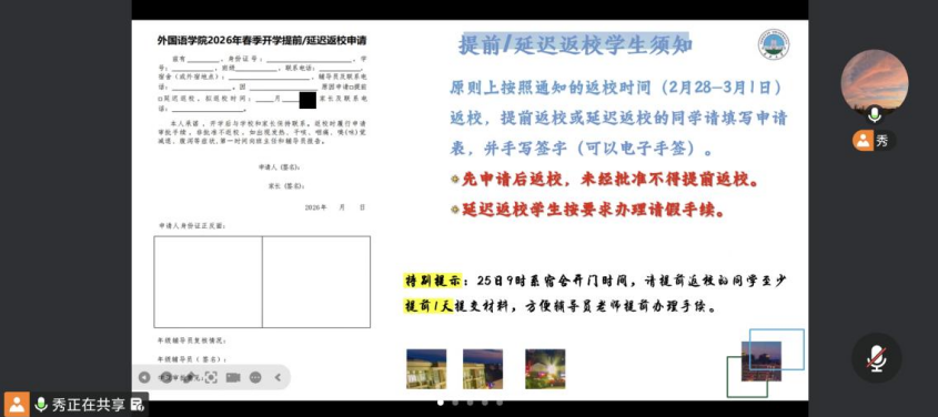 自2月23日起,各班以在线上会议形式开展开学前安全教育与返校工作专题班会。各班班主任围绕返校要求、安全教育、开学初重点工作等内容开展教育。下一步,澳门网投唯一官网将继续压实工作责任、细化工作举措,全力保障学生平安有序返校。