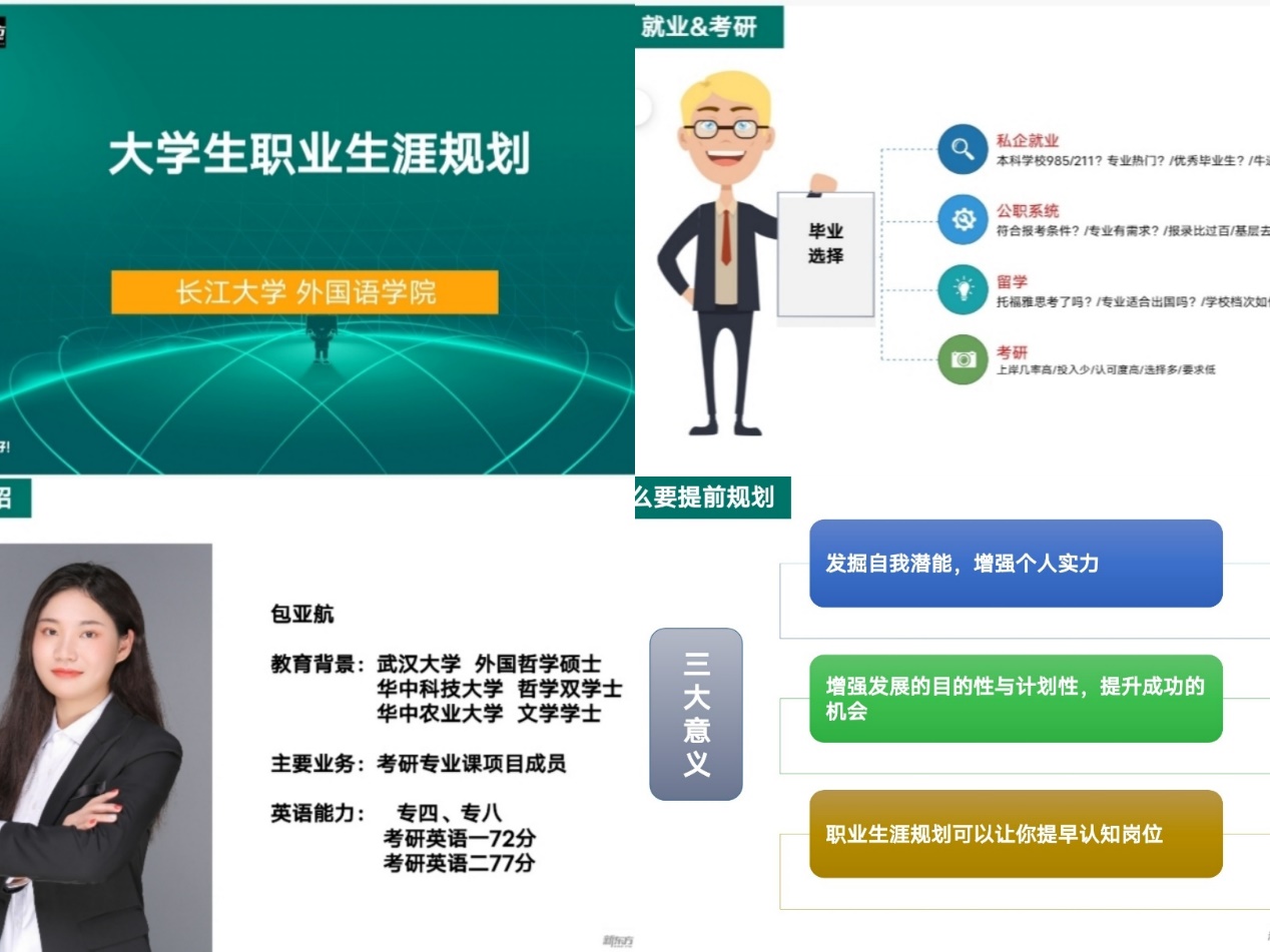 主讲老师就外语专业毕业生去向有哪些、直接就业要如何规划、考研要如何规划等三个问题进行了讲解。其中涉及到了就业信息查询常用方式、信息查询常用网站、考研院校专业选择等等。