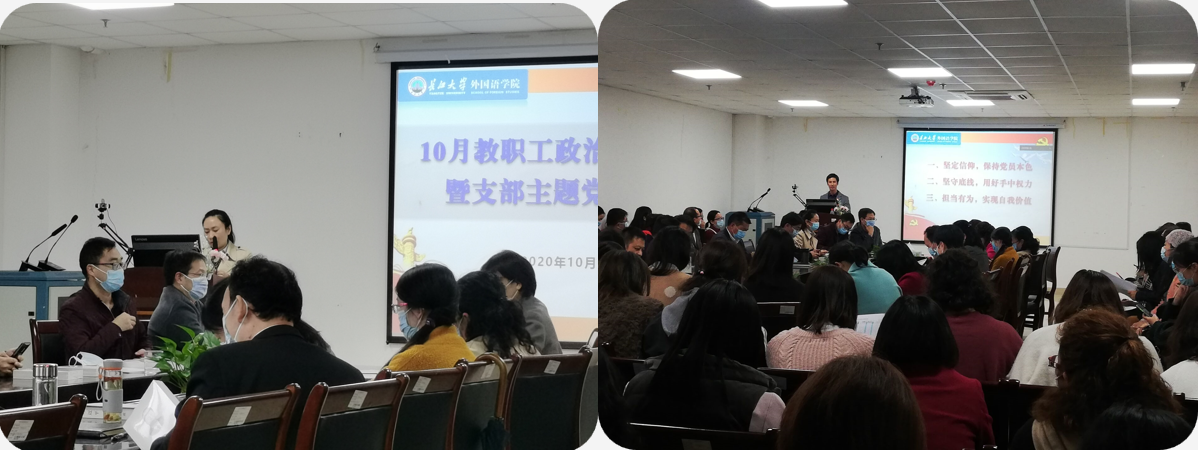 10月15日下午,学院在文科楼712会议室召开全体教职工大会,开展政治理论学习和支部主题党日活动。荆州校区教师现场参会,武汉校区教师通过线上参会,会议由学院党委书记危煜祥主持。