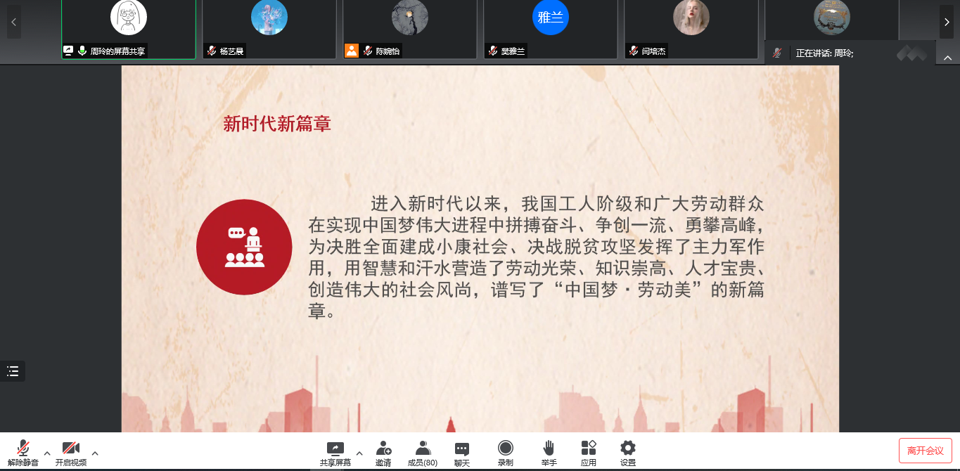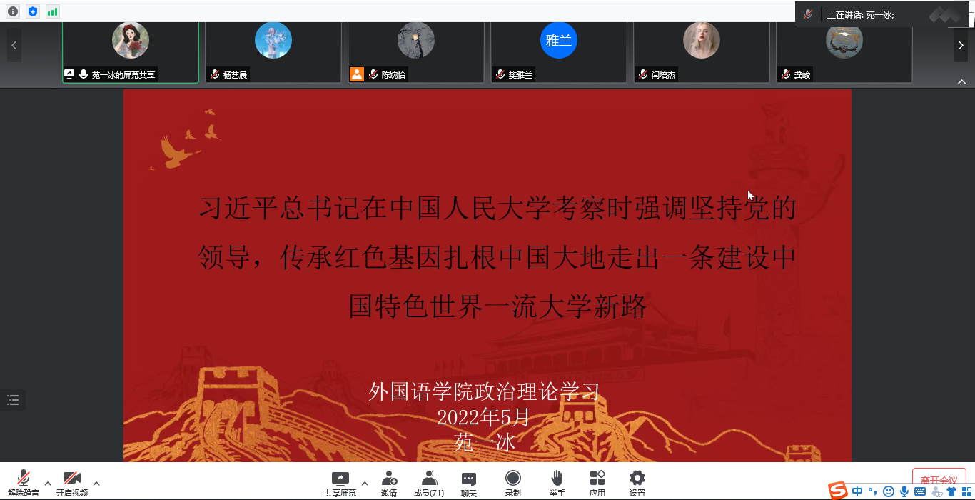会议伊始,21级英语笔译苑一冰同学介绍了习近平在中国人民大学考察时的讲话,激励大家求真务实,做勇担民族复兴重任的时代新人。随后,21级学科英语潘怡西同学汇报学习了习近平在中共中央政治局常务委员会会议上的讲话,呼吁同学们团结一心,配合学校防疫工作。20级学科英语龙晨同学介绍了习近平总书记的两封回信以及两封贺信,强调广大青年要奋发进取,投身建功新时代。20级英语笔译刘雅琴同学以及21级外应吴丽同学共同带领大家学习了习近平在庆祝中国共产主义青年团成立100周年大会上的讲话,呼吁大家认真学习领悟习近平总书记重要讲话精神,为实现中华民族伟大复兴中国梦而不懈奋斗。最后,20级外应周玲同学介绍了“劳模精神”——中国共产党人的精神谱系之十九,希望大家增强创新意识,刻苦钻研,用奋斗书写最美青春。