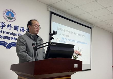 江万哲表示,习近平文化思想开辟了马克思主义文化理论的新境界,为新时代文化强国建设提供了行动指南,赋予了中华优秀传统文化新的时代内涵。学习贯彻习近平文化思想是立足新时代党领导文化建设的实践,是着眼建设中华民族现代文明的目标,更是建设社会主义文化强国的基石。他强调,各位党员同志在学习贯彻习近平文化思想的过程中要从党对社会主义文化建设认识规律中把握习近平文化思想的历史逻辑,从“两个结合”中把握习近平文化思想的理论逻辑,从“七个着力”中把握习近平文化思想的实践逻辑。他希望,全体党员同学一定要坚持和培养文化自信,特别是要通过实践活动等方式去传播中华民族优秀传统文化。