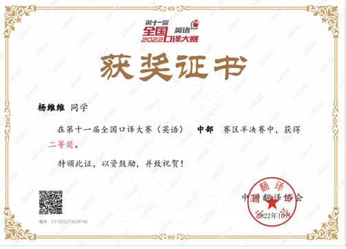 (通讯员 赵宇杰)日前,由中国外文局指导、中国翻译协会主办的第十一届全国口译大赛(英语)交传半决赛落下帷幕。澳门网投唯一官网英语笔译QZ211班研究生刘家怡、杨维维2名同学分别获得中部赛区一等奖和二等奖。其中,刘家怡获晋级全国总决赛交传赛资格。
