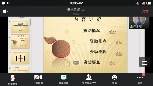 620日,澳门网投唯一官网学工办通过腾讯会议开展了资助育人专项会议。会议由院团委书记兼资助专干许泽琼老师主持,2017级学生干部、获得过资助的学生以及想申请资助的学生参加了会议。