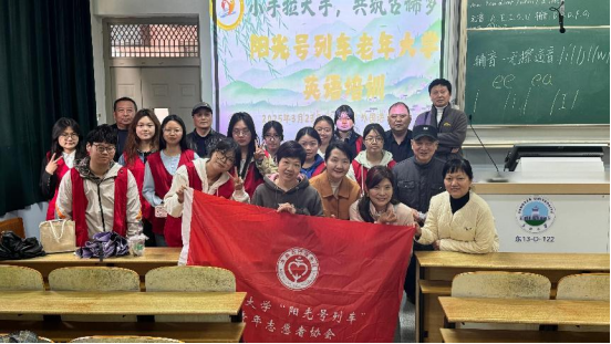 随着课堂进入尾声,志愿者与老年学员们在缀满英语单词卡片的黑板前并肩而立,共同留下了一张特殊的“春日全家福”。镜头中,银发学员们手举亲手标注音标的单词本,志愿者则比出俏皮的“花朵手势”,24张笑脸在“Spring is here!”的齐声欢呼中绽放。快门按下的瞬间,跃动的光影不仅记录下知识与暖意的交融,更定格了跨越年龄的默契与温情。