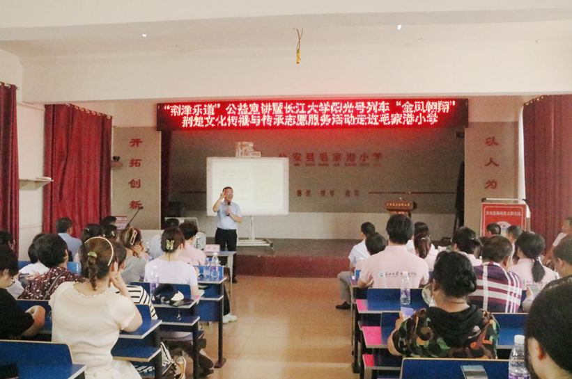 最后,“荆津乐道”公益宣讲团特邀讲师、澳门网投唯一官网人文与新媒体学院卢川博士为现场师生开展了主题为“漫谈楚文化”的公益讲座。卢博士从“荆楚”的由来、地理位置的变迁、荆楚文明与文物和楚乐与礼仪四个方面娓娓道来荆楚文化的前世今生,丰富又生动的荆楚历史小故事、精美的楚乐器图片、详实楚国史料、幽默的语言引起大家的浓厚兴趣,现场反响强烈。来自澳门网投唯一官网澳门网投唯一官网的志愿者李方玲说,从卢博士的讲座中,我深刻感受到楚文化中所蕴涵的筚路蓝缕、奋发图强、敢为人先的精神,作为外语学生应努力打好专业基本功,积极讲好荆楚故事,传播荆楚文化。来自毛家港小学五年级的许沐晨同学说,卢老师的讲课让我了解到原来荆州拥有如此精彩卓绝又丰富多彩的楚文化,作为一名荆州人倍感荣耀。