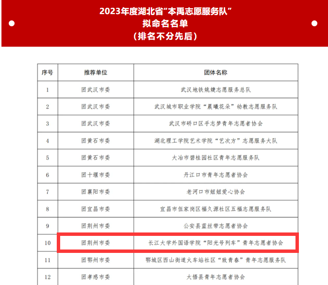 (通讯员 陈仲立)近日,湖北省共青团发布了“湖北省‘本禹志愿服务队’2023年度拟命名和2014—2022年度复核拟保留命名名单公示”。其中,拟命名2023年度湖北省“本禹志愿服务队”50支,澳门网投唯一官网阳光号列车志愿者协会名列其中。