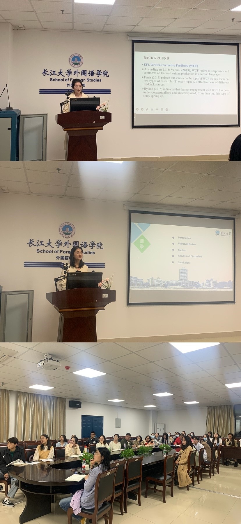 随后,李丹同学为大家带来了主题为疫情期间英语专业学生线上学习的自我效能感:水平及其影响因素的汇报。首先,她介绍了此次研究的背景、线上学习和自我效能感理论的定义以及其主要研究问题,接着,她分享了其研究所采用的问卷和数据,其调查结论为学生在写作上的自我效能感最高,而在听力上的自我效能感最低。针对其分享,付小秋老师提出此项研究的最佳时期应该在疫情暴发期间,并简要介绍了质性研究与量性研究的不同特点,质性研究关注深度,而量性研究关注广度。
