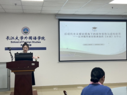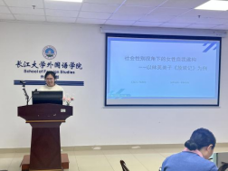 杨刚琴汇报的主题为“社会性别视角下的女性自我建构——以林芙美子《放浪记》为例”。首先,她探讨了社会性别视角下的女性自我建构。接下来,她分析了《放浪记》中女性角色的自我认同和建构,以及社会性别规范的挑战与超越。最后,她指出该研究旨在深化女性文学与性别理论的跨学科对话,具有重要的学术和现实意义。