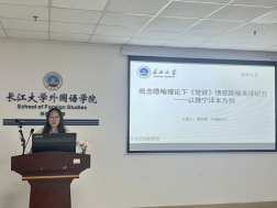 吴天昊同学的主题是“概念隐喻理论下《楚辞》情感隐喻英译研究—以魏宁为例”。该同学的研究涵盖了翻译策略、译本比较、对外传播及语料库应用等多个领域。她认为概念隐喻理论自古希腊时期发展至今,已成为认知和文化研究的重要组成部分,情感隐喻作为认知方式的一种,其在《楚辞》英译中的认知机制和翻译策略对跨文化交流具有重要意义。最后,她指出该研究旨在探讨《楚辞》情感隐喻的英译转换过程及其传递效果,以促进中西文化交流与理解。