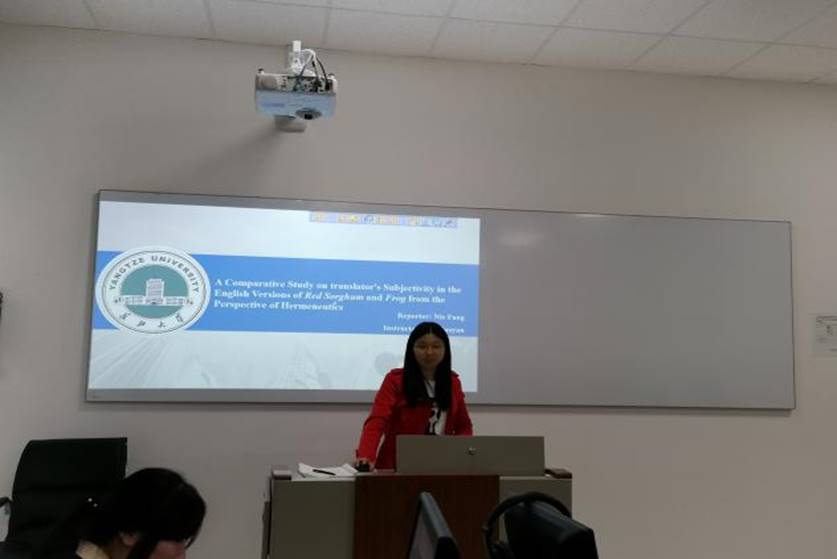 首先由彭思同学向大家做报告,她的报告主题是:英语学习者词典中词汇的文化信息研究。彭思从词典的释义、例证、插图等几个方面,运用丰富的例子,向我们展示了学习者词典中的文化信息,并指出现有的学习者词典提供的文化信息还远远不足。最后彭思同学还给大家分享了几个新出版的有关英语教学的期刊和实用的公众号。聂芳同学的报告主题是:阐释学视角下《红高粱家族》和《蛙》英译本中译者主体性的对比研究。她从研究背景、现实意义和学术意义、研究问题、研究方法等几个方面为我们讲解了她的研究,并给我们大致介绍了她的论文。
