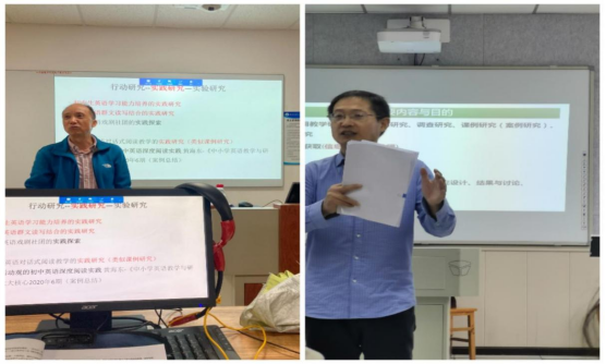 13日上午,谢家成和吴亚华老师立足学员们教研与论文写作方面的困惑,开展了一次基础英语教研常见研究方法与论文写作的活动课。学员们一边和两位指导老师共同阅读下发的论文材料,一边从基础英语教研常用研究类型(行动研究、实践研究、调查研究、课例研究等)和论文写作各部分要点(如标题、摘要、引言、研究设计、文内引用和参考文献规范等)两大维度进行了论文共读和解析。通过文献共读,既了解了常见研究方法和论文写作基本知识,也切实感受到了教研论文的实用性,因为这些论文所涉及的主题,如课外阅读、群文阅读、学习能力培养、多样化作业、可视化写作教学设计、指令语有效性等,均和本次国培的研修主题以及学员们的日常教学活动密切相关。通过本次活动课,学员们普遍认识到自己不仅是教学者,也是研究者。表示今后不仅要好好教学,更要升华自己的教学理论,开展适当的教学研究。