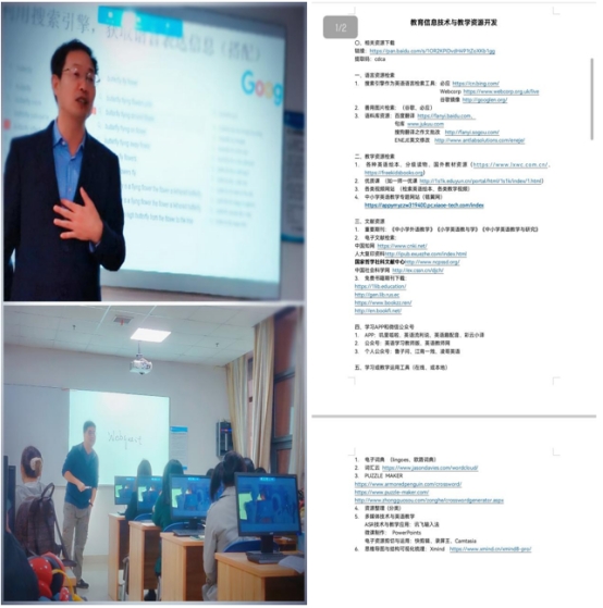 国培第三天上午(10月11日),谢家成和彭沂两位老师分别对研修学员开展“资源获取与整合”的工作坊活动(分两个班开展),其间提供了大量实用的资源获取与整合等信息技术手段、资源及整合案例,尤其是围绕初中英语教学与教研。学员们也分享了自己平时教学中使用的App。研修过程中,老师们还在机房进行了实操。Practice makes perfect。
