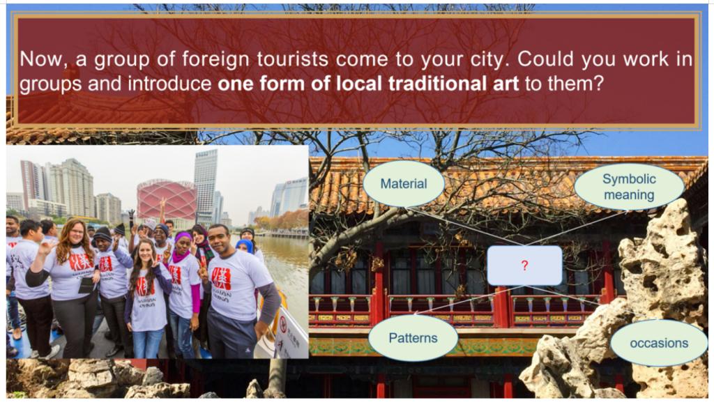 教学展示中的导入环节,史庆玲同学以黄梅戏的名曲《女驸马》为引,引导学生对课文内容进行预测。在预读阶段,她带领学生分析课文结构,由总到分,通过略读和扫读技巧总结结构和大意。在阅读过程中,她引导学生发现并运用关键词,把握阅读的主旨和关键信息,并通过关键词复述文段,锻炼学生的口语表达能力和逻辑思考能力。在阅读后的活动中,她通过回归和总结文章标题,引导学生深入思考传统文化之美,并通过开放讨论与思考,创设情境,让学生分组向外国游客介绍当地的传统文化和艺术形式。