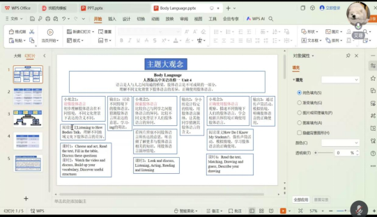 本次磨课分为三大环节。首先是7分钟的说课,每位同学简要说明授课文本所在单元的大主题及子主题、语言大观念、单元教学目标以及对授课文本从what、why、how三个维度的文本分析、授课教学目标确定等。第二个环节为10分钟的无生讲课,全英文进行。最后导师针对每位同学的说课和授课给予简要点评。