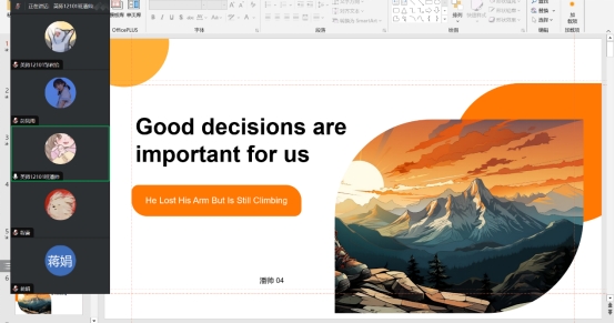 (通讯员 蒋娟)为推动学院师范生教学技能发展,提升师范生的教学设计能力和课堂掌控力,8月27日下午,英语师范12101班的潘帅同学在蒋娟老师的指导下,进行了题为《He Lost His Arm But Is Still Climbing》的阅读与写作课磨课展示。
