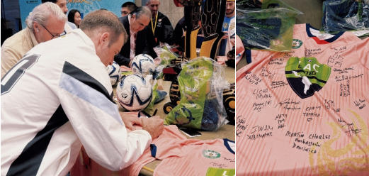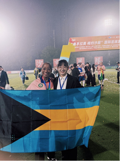 最难忘的是周六晚上,我们与郭区长一同迎接巴哈马驻华大使。汇合后,郭区长向她热情介绍荆州的历史、博物馆与古城墙,也聊起巴哈马的旅游业与交通。我的翻译或许不尽完美,但大使始终报以微笑,耐心倾听并给予鼓励。她告诉我们,因公务耽搁了一天行程,并对第二天的足球赛充满期待。果然,次日她亲自为足球赛开球。赛后,我鼓起勇气邀请她合影,她不仅欣然同意,更优雅地展开巴哈马国旗,笑容温暖如阳光。